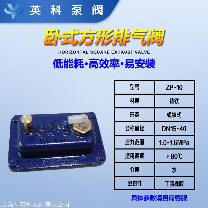 方形排气阀 卧式 ZP-10,实用于工业介质为水的管途上,行为迅疾排斥管道内气体配置,以升高输送水配置的恶果和珍惜管道不致变形割裂,是管道的必备之配置。